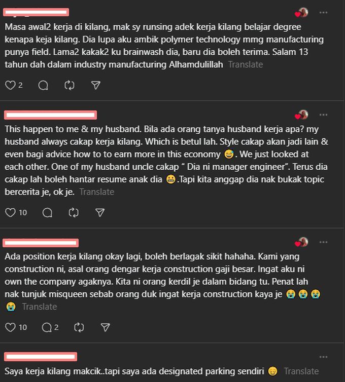 "Kawan aku kerja kilang gaji RM12,000 tapi kalau tanya kerja apa dia akan jawab... masih kerja kilang," demikian reaksi netizen.