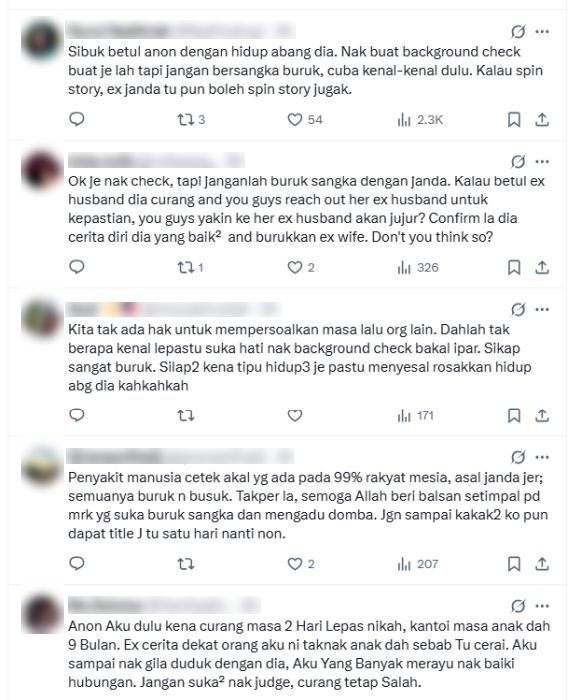 "Janganlah buruk sangka dengan janda. Kalau betul ex-husband dia curang dan korang jumpa ex-husband untuk kepastian, yakin ke bekas ex-husband dia akan jujur?