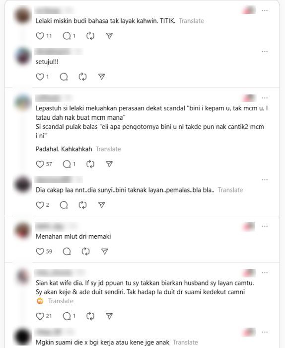 DALAM sesebuah perkahwinan, tanggungjawab seorang suami bukan hanya memberi nafkah atau menyediakan keperluan asas semata-mata.Sebaliknya, perkahwinan juga adalah tentang bagaimana suami melayan isteri dengan penuh hormat, memahami perasaannya dan menunjukkan kasih sayang dalam setiap tindakan. Di laman Threads, seorang wanita berkongsi situasi menyedihkan di sebuah pasar raya apabila dia menyaksikan sendiri 'adegan' isteri dilayan kasar oleh suami. Melayani pasangan dengan baik dapat menjamin kerukunan rumah tangga. -Gambar hiasan"Tadi aku pergi *****. Ada akak tu minta dengan suami dia nak beli deodoran. Laki dia marah cakap, baik beli beras... kalau dah kepam tu kepam juga. "Aku rasa nak terajang jantan macam ni. Bini kau dukung anak, pegang lagi seorang. Kau berlenggang sambal main phone. Haish baran aku," tulisnya dalam perkongsian berkenaan.ARTIKEL BERKAITAN: “Moga Tuhan sempitkan rezeki” - Ramai geram sikap suami kedekut... Duit belanja dapur hanya RM300, ibu sendiri dapat sampai empat angka!ARTIKEL BERKAITAN: Isteri 'ajar' suami cuba 'lari' bayar makan, ugut panggil bapa selesai bil... Naik lemak akibat dimanjakan!Simpati terhadap nasib wanita itu, dia bertindak membeli sebotol deodoran untuk dihadiahkan kepada ibu yang sedang mengawal dua anaknya itu.Namun ujarnya, wanita berkenaan menolak dengan sopan kerana ingin meminta izin suami terlebih dahulu.Seorang wanita melihat seorang isteri dilayan kasar oleh suaminya di pasar raya.Suami enggan membelikan isterinya deodoran dan melontarkan kata-kata pedih.Wanita itu beli deodoran untuk dihadiahkan kepadanya, tapi ditolak kerana ingin minta izin suami.Perkongsian berkenaan mendapat simpati netizen yang rata-ratanya mengecam sikap si suami.Netizen menekankan pentingnya budi bahasa dan menghormati pasangan dalam rumah tangga.Ringkasan ini dijana oleh AI"Sebenarnya saya belikan deodoran dan kejar akak tu. Tapi dia tak nak ambil. "Dia kata nak minta izin suami dia dulu. Baik betul akak tu. Saya tunggu la. Lepas naik kereta akak tu tak turun. Saya memalukan dia ke?" tulisnya lagi.Perkongsian berkenaan mengundang perhatian netizen yang rata-ratanya menzahirkan rasa simpati terhadap nasib wanita yang dilayan buruk oleh suami.Antara reaksi netizen terhadap perkongsian berkenaan.Ramai memuji keprihatinan wanita itu, tetapi pada masa sama mengecam sikap suami yang dilihat tidak menghormati pasangan sendiri. "Saya kerja 'retail' dulu, nampak banyak contoh lelaki-lelaki yang bercakap kasar dan kurang ajar dengan isteri."Lepas tu menggelupur tengok perempuan lawa wangi, pertikai kenapa bini orang lain lawa. Dah kau kedekut!!"Lelaki miskin budi bahasa tak layak kahwin. Titik," antara komen netizen.