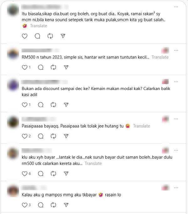 "Lantaklah dia, nak suruh bayar duit saman boleh tapi bayar dulu RM500 untuk calarkan kereta," antara komen netizen.
