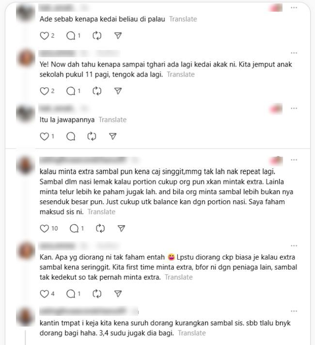 "Kalau minta 'extra' sambal pun kena caj seringgit, memang tidaklah nak 'repeat' lagi. Sambal kalau 'portion' cukup, orang takkan minta 'extra'. Lainlah minta telur lebih, fahamlah juga.