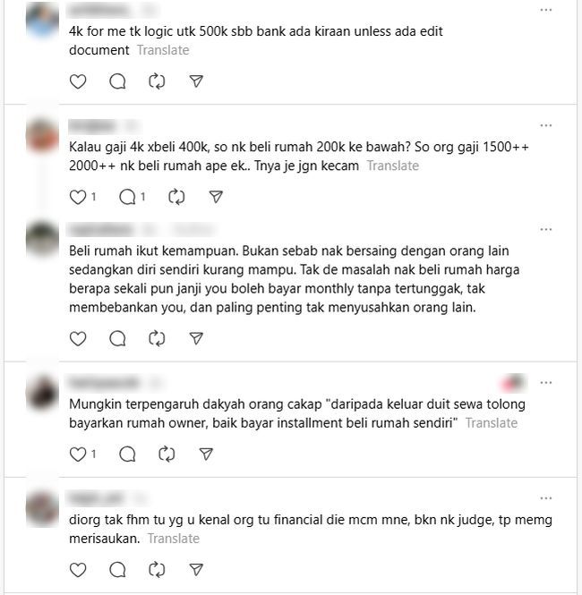 "Bagi saya RM4,000 tak logik untuk rumah harga RM500,000 sebab bank ada kiraan," komen netizen.