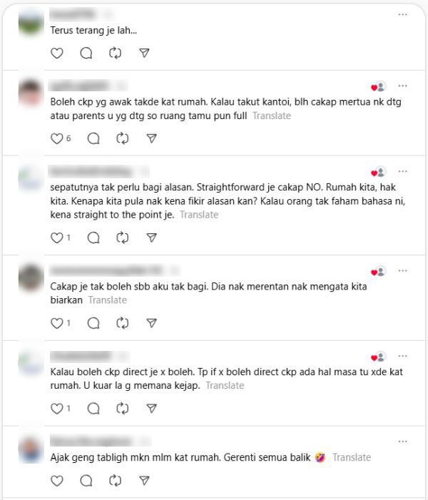 Tidak kurang yang menasihatkan agar wanita itu lebih tegas dalam menyatakan pendirian, terutama apabila kehadiran tetamu boleh mengganggu ruang peribadi keluarga.