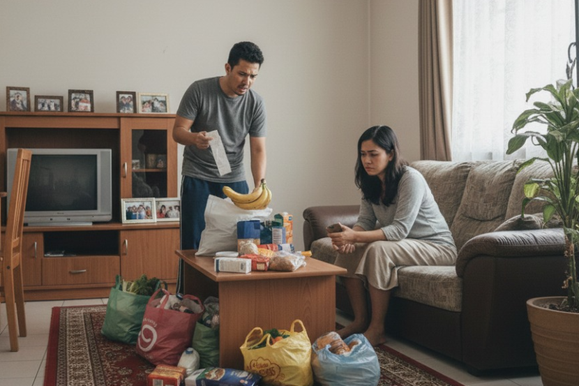 Suaminya memeriksa satu persatu barang yang dibeli walaupun wanita itu memberitahu kesemuanya adalah barangan dapur untuk keperluan seisi rumah.