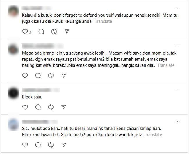 "Moga ada orang lain yang sayang awak lebih. Macam wife saya dengan ibunya tak rapat. Tapi dengan emak saya, rapat betul," komen yang lain pula.