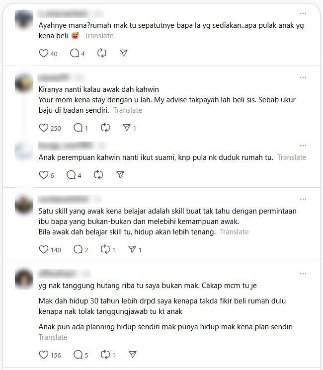 Di ruangan komen, rata-rata warga maya meluahkan simpati terhadap wanita berkenaan kerana tersepit antara kehendak ibu dengan kemampuan serta cita-cita sendiri.