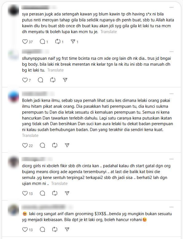 "Ada sesetengah kawan yang belum kahwin tapi apabila putus (cinta) meroyan (hilang arah) tahap gila... apabila selidik rupanya dah pernah buat (seks).