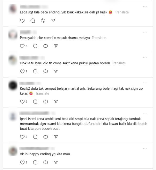 Di ruangan komen, rata-rata warga maya meluahkan rasa kagum dengan keberanian kakak individu tersebut kerana bertindak demi melindungi diri sendiri.