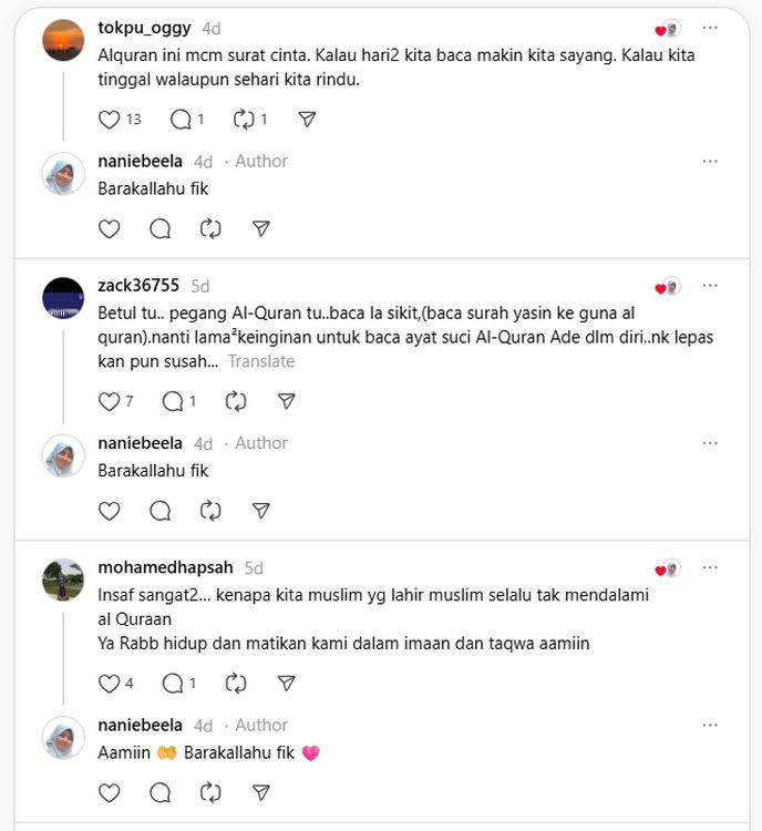 "Al-Quran ini macam surat cinta. Kalau hari-hari kita baca makin kita sayang. Kalau kita tinggal walaupun sehari kita rindu," antara komen netizen.