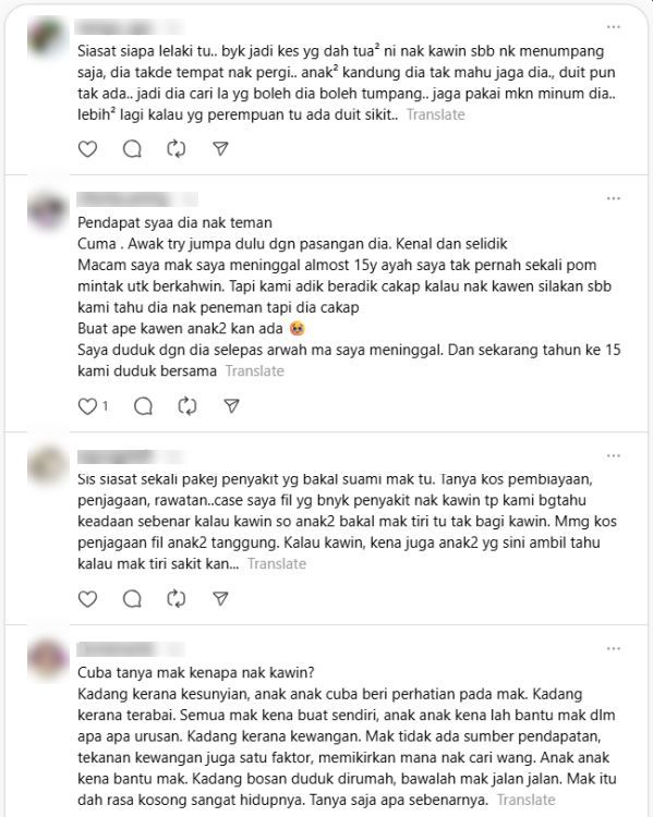"Dia perlukan kawan, bukan suami. Lagipun, 70 tahun agak tua untuk jadi isteri, kecuali jika bakal suami itu jenis provider," komen netizen.
