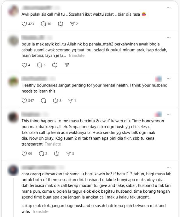 DALAM sesebuah rumah tangga, cabaran bukan hanya datang daripada pasangan semata-mata.Sebaliknya, campur tangan orang sekeliling seperti ahli keluarga juga boleh memberi kesan terhadap keharmonian perkahwinan. Berdepan situasi yang sama, seorang wanita tampil membuat luahan di laman sosial mengenai rasa kurang senangnya terhadap sikap ibu mentua yang kerap 'mengganggu' suaminya.Lelaki yang sudah berkahwin tetap mempunyai tanggungjawab terhadap ibunya. -Gambar hiasan "Saya rindu suami walaupun dia dekat sebelah. Ibunya selalu sangat call dia. Dari pagi sampai ke malam buta. Tak kira masa, di mana jua."Kadang tu terdengar, random je topik contohnya lepaskan kucing dari sangkar, main dengan anjing jiran, terserempak dengan saudara dekat dobi. Harmless topic je. "Cumanya.... anak dia dah berkahwin tau. Kadang tu macam tak kena masa, tak kena tempat. Turn off terus. Dan bukan sekali dua. Banyak kali. Boleh dikatakan setiap hari," tulisnya dalam perkongsian tersebut. ARTIKEL BERKAITAN: Umur 70 tahun masih toksik, nak kongkong semua perkara... Anak nekad pindah dari rumah ibu, mahu jaga mental isteriARTIKEL BERKAITAN: Mentua kaki pusing, guna suami ambil ‘personal loan’ buat rumah... Lepas siap ipar-duai ‘rasmi’ dulu, pemilik disuruh pindah!Bukan mahu memisahkan atau menidakkan hubungan antara seorang ibu dengan anak, wanita tersebut berpandangan mentuanya itu terlalu berlebih-lebih sehingga dirinya sebagai isteri berasa tersisih. "Saya tahu mak dia rindu dia. Setiap hari suami pergi rumah mak dia. Sebelum pergi kerja, balik kerja. Pernah juga, suami balik hanya untuk makan malam dengan saya dan dia pergi rumah mak dia semula, balik pukul 4 pagi.Seorang wanita kurang senang dengan sikap ibu mentua yang kerap menghubungi suaminya.Ibu mentua sering menelefon suaminya tanpa mengira masa.Wanita itu berasa tersisih kerana suami lebih banyak meluangkan masa bersama ibu malah setiap hari pergi menjenguk wanita itu di rumah.Walaupun menyayangi mentua, dia mengakui sikap tersebut membuatkan dirinya jauh daripada suami.Netizen menasihatkan agar perkara itu dibincangkan demi keharmonian rumah tangga.Ringkasan ini dijana oleh AI"Basically, suami lagi lama habiskan masa dengan keluarga dia berbanding dengan saya. Bila dia dengan saya, mak dia masih lagi call."Saya sayang mak mentua tapi sikapnya buat saya tak selesa dan rasa jauh daripada suami," luahnya lagi.Tidak lagi mampu memendam perasaan, dia becadang untuk menyuarakan perkara berkenaan kepada suaminya untuk mencari penyelesaian.Sebahagian daripada komen netizen."Doakanlah perbincangan berjalan lancar dan tak ada pergaduhan berlaku," kongsinya lagi.Di ruangan komen, warga maya tampil dengan reaksi bercampur, dengan ada yang berpendapat wanita berkenaan tidak seharusnya terlalu sensitif apatah lagi suaminya akrab dengan ibu sendiri.Namun, ada juga yang menyarankan wanita itu supaya bersuara jika mahu rumah tangganya harmoni.