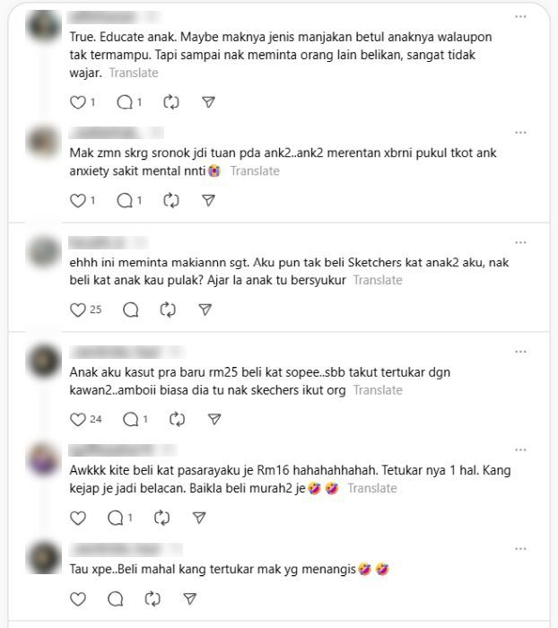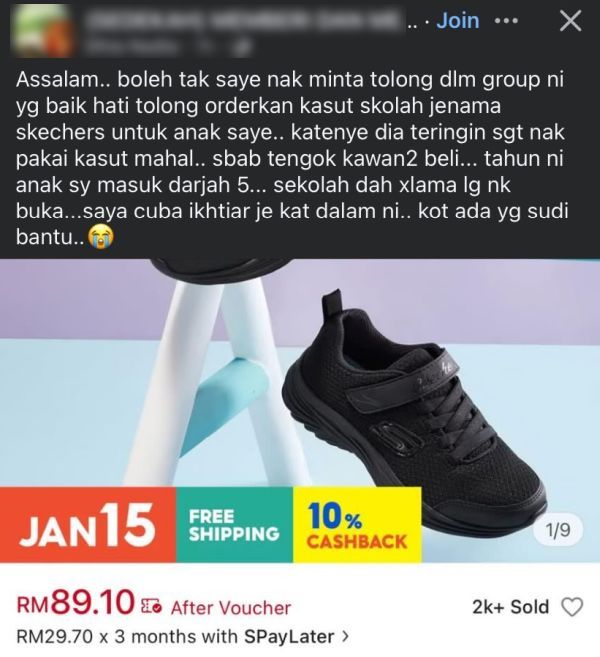 SESI baharu persekolahan baru sahaja dibuka dan ibu bapa pastinya menjadi golongan paling sibuk kerana perlu menguruskan anak masing-masing.Media sosial turut meriah dengan perkongsian ibu bapa mengenai persiapan sekolah, pengalaman pertama mendaftar anak dan sebagainya. Namun, hantaran seorang wanita menjelang sesi baharu persekolahan mencuri perhatian apabila dia berkongsi hasrat mendapatkan sepasang kasut sekolah berjenama untuk anaknya yang bakal memasuki darjah 5.Perkongsian wanita berkenaan yang menjadi tular di media sosial. Dalam perkongsian di sebuah grup Facebook, wanita itu memohon belas ihsan warga maya untuk membantu menempah kasut tersebut demi merealisasikan kehendak anaknya."Assalam... Boleh tak saya nak minta tolong dalam group ni. Yang baik hati tolong orderkan kasut sekolah jenama Skechers untuk anak saya."Katanya dia teringin sangat nak pakai kasut mahal sebab tengok kawan-kawan beli," tulisnya dalam hantaran berkenaan. ARTIKEL BERKAITAN: "Patutnya percuma saja" - Wanita 'berhujah' minta kerajaan taja buku semua murid... Simpati nasib B40, ibu bapa ramai anakARTIKEL BERKAITAN: Sebak lihat ibu batal beli buku sekolah anak sebab tak cukup duit, suami isteri sanggup bantu bayar lebih RM500Wanita tersebut turut memuat naik gambar kasut sekolah yang berharga RM89.10 itu seperti mana dipaparkan di sebuah laman e-dagang.Dalam hantarannya juga, wanita berkenaan berkata dia sekadar mencuba nasib di laman sosial, berharap sekiranya ada insan baik hati yang sudi memenuhi keinginan anaknya.Seorang wanita minta warga maya belikan kasut sekolah berjenama Skechers untuk anaknya darjah 5.Wanita itu sekadar mencuba nasib dan memohon belas ihsan, memuat naik gambar kasut berharga RM89.10.Permintaan tersebut mencetuskan kecaman netizen kerana dianggap mengemis simpati menggunakan anak.Ramai menegur wanita itu terlalu mengikut kehendak anak, sedangkan ada alternatif lebih mampu milik.Ringkasan ini dijana oleh AI"Sekolah dah tak lama lagi nak buka. Saya cuba ikhtiar je dekat dalam ni. Kot ada yang sudi membantu," akhirinya.Perkongsian wanita berkenaan ternyata mengundang kecaman warga maya.Bagi mereka, wanita tersebut tidak wajar menggunakan anak sebagai alasan untuk mengemis simpati ramai di laman sosial bagi mendapatkan sesuatu dengan mudah.Reaksi sebahagian netizen yang mengecam wanita berkenaan.Tidak kurang juga ada yang menegur wanita itu kerana dianggap terlalu mengikut kehendak anak sedangkan banyak alternatif mampu milik yang lebih praktikal dan realistik."Ini meminta makian sangat. Aku pun tak beli Skechers dekat anak-anak aku, nak beli dekat anak kau pula? Ajarlah anak tu bersyukur."Orang lain semua bekerja untuk menampung keperluan hidup, tapi ada segelintir yang tak sedar diri suka meminta-minta," demikian antara komen netizen.