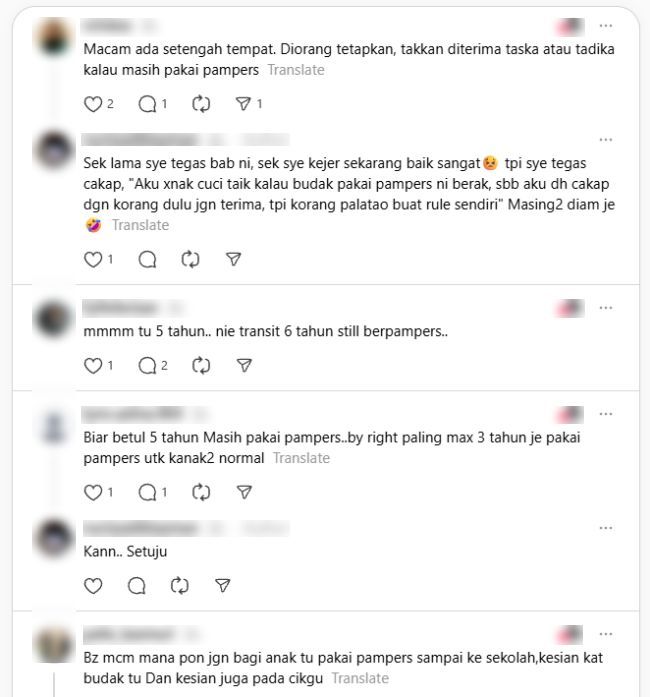 MENJADI ibu bapa pada era serba moden datang bersama pelbagai cabaran baharu termasuk soal pengurusan kendiri walaupun ada pihak mungkin menganggapnya remeh.Salah satu daripadanya ialah latihan ke tandas, yang lazimnya dipraktikkan sejak si kecik berusia tiga hingga empat tahun. Di laman Thread, seorang guru taska tampil memberikan teguran berdasarkan pengalamannya apabila mendapati kanak-kanak berusia sekitar lima tahun masih belum dilatih untuk ke tandas.Menurutnya, isu ini bukan sekadar menyusahkan pihak pengajar, tetapi turut menimbulkan persoalan tentang peranan ibu bapa dalam membentuk perlakuan anak yang seharusnya bermula di rumah.Sesetengah sekolah swasta tidak menerima murid masih mengenakan lampin pakai buang. -Gambar hiasan AI"Hari tu terjumpa Thread... ada seorang ibu ni, anak dia pakai lampin pakai buang di usia lima tahun dan cakap, itu memang kerja guru tadika kalau anak dia berak, kena basuh."Kenapa ye? Saya tahun ni dapat budak lima tahun, ramai pakai lampin pakai buang. "Kenapa ibu bapa? Kenapa manjakan anak tak kena tempat? Sampai bila nak pakai lampin pakai buang? Najis dah macam orang dewasa tau," luahnya dalam hantaran berkenaan. ARTIKEL BERKAITAN: Wanita bujang pertikai ibu bapa hantar anak ke tadika swasta, anggap nak ‘flex’... Hujung bulan merungut tak cukup duitARTIKEL BERKAITAN: Individu dedah sisi gelap kerja di taska, kerahan tenaga tahap maksimum! Banting tulang 10 jam dibayar RM1,400Dia berpendapat situasi tersebut bukan sahaja makan masa malah mengganggu proses pembelajaran apabila guru terpaksa menguruskan hal kebersihan sehingga menjejaskan fokus terhadap aktiviti pendidikan lain.Dalam pada itu wanita berkenaan turut berkongsi pengalamannya bertugas di dua buah sekolah yang mempunyai pendekatan berbeza membabitkan perkara berkenaan. Seorang guru taska menegur sikap ibu bapa yang masih belum melatih anak ke tandas walaupun sudah berusia lima tahun.Menurutnya, ramai kanak-kanak seusia itu masih memakai lampin pakai buang ketika berada di taska.Situasi tersebut menyukarkan guru kerana perlu menguruskan kebersihan sehingga mengganggu proses pembelajaran.Wanita itu turut berkongsi pengalamannya di sekolah swasta sebelum ini yang tegas dalam hal ini.Netizen bersetuju latihan ke tandas dan sikap berdikari anak perlu bermula di rumah.Ringkasan ini dijana oleh AI"Sekolah lama saya, soalan pertama sebelum daftar mesti pakai lampin pakai buang lagi ke tak? Kalau jawapan ibu bapa masih pakai, maaf memang tak terima."Tapi sekolah saya sekarang, terima je semua. Untuk pengetahuan, kedua-dua sekolah swasta. Tapi sekolah dulu sangatlah jaga kebajikan guru, yang kedua ni 'cincai' je," tulisnya lagi.Perkongsian wanita tersebut mencetuskan perbincangan hangat dalam kalangan netizen, dengan ramai bersetuju bahawa latihan ke tandas seharusnya bermula di rumah dan bukan dibebankan sepenuhnya kepada pihak sekolah. Sebahagian komen netizen. Selain itu ada juga yang berpendapat ibu bapa perlu lebih bertanggungjawab dalam membentuk tahap berdikari anak sebelum menghantar mereka ke institusi pendidikan awal."Bukan manjakan ni tapi parents pemalas. Semua nak senang dan semua harap orang lain yang uruskan."Kesiannya nak handle. Dan ya, ini memang parents yang pemalas. Macam-macam alasan bagi. "Lepas ni tadika dah boleh kot caj extra untuk parents yang hantar anak diaorang pergi tadika pakai diapers," demikian antara komen netizen.