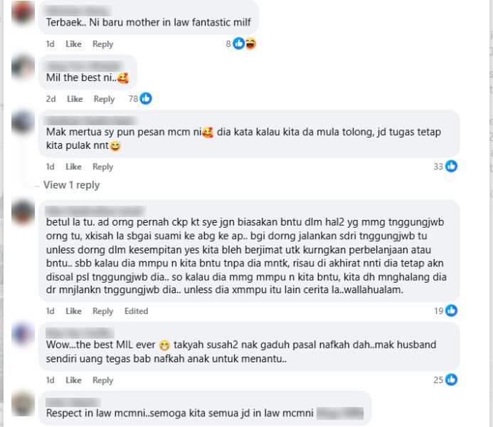 PERKONGSIAN kisah hubungan dingin antara mentua dan menantu terutamanya perempuan sering disajikan di laman sosial.Bagaimanapun ada juga kisah yang memperlihatkan sisi positif dan penuh pengajaran, sebagaimana perkongsian wanita ini mengenai ibu mentuanya. Menerusi hantaran di media sosial, wanita tersebut menceritakan pengalaman yang tidak disangka-sangka apabila ditegur oleh ibu mentuanya ketika baru seminggu mendirikan rumah tangga. Dikurniakan mentua yang baik merupakan rezeki buat wanita bergelar isteri. -Gambar hiasan AI"Baru seminggu kahwin dah kena marah dengan mak mentua. Semalam pergi berbelanja barang dapur sama-sama. Mak mentua perasan yang saya cuma ambil RM50 daripada anak dia (suami)."Kemudian dia buat isyarat, 'RM50 mana cukup'! Saya jawab, cukuplah mak. Nak beli sikit-sikit je ni. Lagipun suami saya dah transfer RM50 sebelum tu," tulisnya dalam hantaran berkenaan.ARTIKEL BERKAITAN: Jaga mak mentua sampai akhir hayat, jururawat tak sangka ipar duai buat kejutan sehari selepas arwah meninggal... tengah kerja disuruh balik awal!ARTIKEL BERKAITAN: Tak pernah ziarah tangan kosong... Mesti bawa barang dapur, keperluan bayi! Lelaki syukur mentua faham susah anak, menantuTidak sekadar itu, wanita tersebut berkata, ibu mentuanya memberikan satu nasihat yang cukup bermakna kepada dirinya sebagai isteri yang baru melangkah ke alam perkahwinan.Menurut wanita tersebut, ibu mentuanya menegaskan bahawa dia tidak sepatutnya membiasakan diri mengeluarkan wang sendiri untuk keperluan rumah tangga kerana nafkah merupakan tanggungjawab wajib seorang suami.Seorang wanita kongsi pengalaman ditegur ibu mentua ketika baru seminggu mendirikan rumah tangga.Kejadian berlaku ketika mereka keluar membeli barangan dapur dan ibu mentua menyedari dia hanya menggunakan RM50 daripada suami.Ibu mentua menegur dan menasihati agar isteri tidak membiasakan diri menggunakan wang sendiri untuk belanja rumah.Menurut ibu mentua, nafkah adalah tanggungjawab wajib suami, manakala isteri boleh membantu dalam perkara lain sahaja.Perkongsian itu mendapat pujian netizen yang menyifatkan ibu mentua tersebut matang dan memahami peranan dalam rumah tangga.Ringkasan ini dijana oleh AI"Kemudian dia cakap, biar dia (suami) yang keluar duit. Nak tolong, tolong benda lain macam isi minyak ke, berjalan ke, apa-apalah. Tapi bab duit rumah, belanja dapur, jangan biasakan guna duit sendiri. Minta je duit dia," tulisnya.Nasihat tersebut, katanya, bertujuan untuk memastikan suami menggalas peranan dan tanggungjawab wajib sejak awal perkahwinan, selain mendidik isteri agar tidak memikul beban yang bukan sepatutnya dipikul.Perkongsian itu mengundang pelbagai reaksi daripada netizen dengan rata-ratanya memuji sikap ibu mentua berkenaan yang dilihat matang serta memahami konsep nafkah dalam rumah tangga. Netizen menyifatkan wanita berkenaan bertuah kerana dikurniakan mentua baik hati. Tidak kurang juga yang menganggap nasihat tersebut sebagai satu peringatan berguna buat pasangan pengantin baharu agar lebih jelas tentang peranan masing-masing dalam melayari bahtera perkahwinan."Inilah ibu mentua terbaik. Tak payah susah-susah gaduh bab nafkah dah."Satu dalam sejuta dapat mentua macam ni. Wahai menantu pandai-pandailah jaga hati mentua ye."Dulu duduk dengan mentua, mentua yang bagi duit suruh beli makanan sebab dia tak sempat masak sebelum masuk pejabat," antara komen netizen.