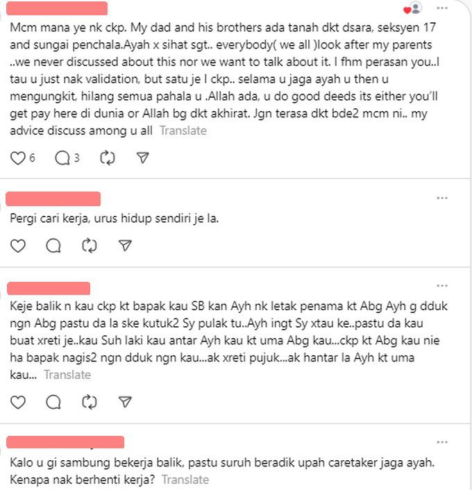 SEORANG wanita meluahkan rasa terkilan dan kecil hati apabila pengorbanannya, termasuklah kesanggupan berhenti kerja demi menjaga bapa yang uzur seolah-olah tidak dipandang oleh warga emas itu.Lebih menambah rasa pilu apabila bapanya juga didakwa enggan meletakkan namanya sebagai penama akaun bank walaupun sekadar bertindak sebagai pentadbir. "Aku yang sanggup berhenti kerja jaga dia (ayah) tapi nak letak penama akuan bank pun, tak sanggup nak sebut nama aku.Segelintir individu sanggup berhenti kerja demi menjaga orang tua yang sakit. -Gambar hiasan"Mula-mula dia cakap 'tak apa, tengok dulu' kemudian aku cakap yang dia kena buat keputusan juga. Okay bapa letak nama abang, dia kata nanti bagitahu," luahnya di Thread.Menurut wanita ini lagi, sikap pilih kasih bapanya itu membuatkan dia berasa terkilan dan tertanya-tanya kenapa hatinya tidak dijaga meskipun telah banyak berkorban.Dia turut menjelaskan bahawa apa yang diharapkan daripada bapa bukan untuk kepentingan diri sendiri sebaliknya bagi memudahkan urusan pembahagian harta dan faraid sekiranya kematian berlaku.ARTIKEL BERKAITAN: Pemuda korbankan kerjaya, tolak tawaran belajar... Sanggup balik kampung jaga bapa sakit - “Abah hanya ada satu”ARTIKEL BERKAITAN: Sejak Form 3 anak angkat jaga mak ayah sakit sampai hujung nyawa, 2 kali berhenti kerja... Umur 30 tahun dilantik jadi CEO 3 anak syarikatMalah kata wanita ini, selaku anak bongsu, dia yang memikul segala tanggungjawab menguruskan hal berkaitan keluarga termasuk urusan faraid arwah ibunya sebelum ini."Aku yang rela ambil tanggungjawab urus faraid bagi pihak abang-abang, kakak-kakak. Tapi bapa aku sikit pun tak pandang apa aku dah buat."Aku tak minta dia bagi semua duit pada aku... cuma macam tak nampak langsung aku sebagai anak yang jaga dia. Kakak suruh letak penama sebagai nama aku pun, dia senyap seribu bahasa.Wanita sanggup berhenti kerja jaga bapa uzur.Terkilan tak dipilih sebagai penama akaun bank bapa.Dakwa bapa pilih kasih, tak hargai pengorbanan.Anak bongsu urus faraid arwah ibu dan hal keluarga.Netizen simpati, nasihat sabar dan jaga emosi.Ringkasan ini dijana oleh AI"Common sense dia tak ada, dia tak kisah langsung pada aku," tambahnya, sayu.Menurut wanita ini, meskipun terguris hati, namun sikap dan tingkah laku bapanya itu mengajar dirinya tentang erti keikhlasan seorang anak tanpa dibalas ucapan terima kasih.Perkongsiannya itu mengundang pelbagai reaksi netizen yang rata-rata bersimpati dengan nasib menimpanya.Warga maya berkongsi pengalaman dan pandangan.Tidak kurang juga yang menasihatinya supaya menjaga emosi dan terus kuat menghadapi ujian sebagai anak yang memikul tanggungjawab besar dalam keluarga."Cuba fikir dari sudut yang baik, besar pahala yang awak buat tu, cuma syaitan saja bisik-bisik main perasaan macam tu."Ada sebab ayah kamu tak letak nama kamu tapi nama kamu sudah terpahat di hati dia. Jangan berkecil hati."Hidup ini jangan terlalu berharap dengan harta orang tua, jasa dia jaga kita sampai besar pun tak terbalas," demikian antara reaksi netizen.