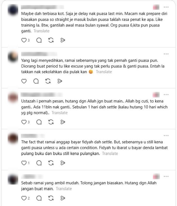 GANTI puasa Ramadan bukan sekadar pilihan, sebaliknya satu kewajipan kepada setiap Muslim yang meninggalkan ibadah tersebut atas sebab tertentu. Bagi wanita yang tidak berpuasa kerana uzur syarie seperti haid, tuntutan untuk menggantikan puasa itu tetap terpakai sebaik sahaja mereka mampu melaksanakannya sebelum tibanya Ramadan seterusnya. Namun tidak dinafikan, masih ada dalam kalangan wanita yang dilihat mengambil ringan soal mengganti puasa walaupun tempoh setahun dianggap mencukupi untuk berbuat demikian.ARTIKEL BERKAITAN: 2 bulan sebelum Aidilfitri, wanita mula gelisah... Benci hadap ahli keluarga, amalan berkumpul ramai-ramaiARTIKEL BERKAITAN: Wanita ‘judge’ pengunjung masjid, hanya ramai waktu berbuka tapi tak tunggu solat jemaah - “Ni tempat makan free ke?”Menerusi satu perkongsian di media sosial, seorang wanita mempersoalkan sikap segelintir pihak yang tidak sempat menggantikan puasa haid sehingga masuk Ramadan berikutnya."Saya tak faham kenapa ada perempuan period yang tak sempat ganti puasa dalam tempoh setahun sebelum tiba bulan puasa berikutnya? "Sampai kena bayar fidyah. Anda buat apa selama ni? Pandang remeh je benda ni?" tulisnya.Orang tua yang uzur adalah kategori yang tidak diwajibkan puasa dan diberi keringanan membayar fidyah. -Gambar hiasan AIMenurutnya, alasan seperti sakit berpanjangan, hamil atau menyusukan anak adalah situasi yang boleh difahami kerana melibatkan faktor kesihatan dan kemampuan fizikal."Tapi kalau sebab period sahaja, kemudian tak ganti-ganti juga?" ujarnya lagi.Tambahnya, terdapat banyak ruang dan peluang untuk menggantikan puasa dalam tempoh setahun, termasuk ketika melakukan puasa sunat seperti enam hari di bulan Syawal.Seorang wanita mempersoalkan sikap segelintir pihak yang tak ganti puasa haid sehingga masuk Ramadan seterusnya.Dia tidak memahami bagaimana tempoh setahun masih tidak cukup hingga akhirnya perlu membayar fidyah.Baginya, alasansakit berpanjangan, hamil atau menyusu boleh diterima, tetapi bukan haid.Katanya, banyak peluang dan masa untuk ganti puasa.Netizen bersetuju dan menegaskan hutang puasa wajib diganti dan tidak boleh dipandang ringan.Ringkasan ini dijana oleh AI"Boleh ganti waktu puasa enam. Waktu ada puasa-puasa sunat. Paling malas pun puasa sehari dua je dalam sebulan, lama-lama cepat habis," katanya.Perkongsian tersebut mengundang pelbagai reaksi dalam kalangan netizen, dengan ada yang bersetuju bahawa disiplin dan perancangan amat penting bagi memastikan tanggungjawab itu tidak tertangguh."Kalau alasan kerja atau travelling... saya rasa ia alasan yang tak boleh pakai. Kita yang kena cari masa. "Ustazah saya pernah pesan, hutang dengan Allah jangan buat main. Allah bagi cuti, jadi kena ganti,"Ramai anggap bayar fidyah dah selesai. Tapi sebenarnya masih kena ganti puasa melainkan ada keadaan tertentu," demikian komen netizen.Sebahagian daripada komen netizen.Kewajipan ganti puasaWanita yang tidak berpuasa (termasuk disebabkan haid) pada bulan Ramadan wajib menggantinya (qada) pada hari lain, berdasarkan sebuah hadis yang diriwayatkan oleh Mu'azah Al-'Adawiyyah, bermaksud:"Aku pernah bertanya kepada Aisyah RA lantas aku berkata: Mengapakah wanita haid itu perlu mengantikan puasanya tetapi tidak menggantikan solatnya? Kemudian Aisyah menjawab: Kami telah didatangi haid dan kami diperintahkan untuk menggantikan puasa (yang ditinggalkan kerana haid) tetapi tidak diperintahkan untuk menggantikan solat"Golongan ini diwajibkan untuk qada puasa sebelum tibanya bulan Ramadan akan datang.Jika mereka gagal menggantikan puasa, maka mereka perlulah qada puasa serta bayar fidyah mengikut jumlah hari yang ditinggalkan.