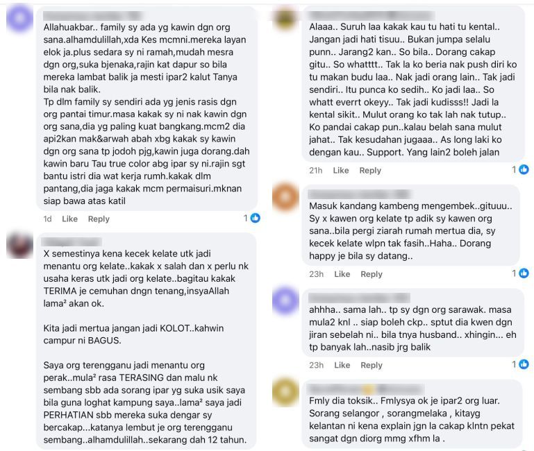 DALAM sebuah perkahwinan, penyatuan dua hati bukan sekadar melibatkan pasangan suami isteri tetapi keluarga kedua-dua belah pihak.Namun tidak semua ikatan pernikahan indah seperti diimpikan lebih-lebih lagi wujud jurang yang sukar dirapatkan, sebagaimana perkongsian seorang individu ini di laman sosial. Dalam hantarannya, dia meluahkan rasa simpati terhadap nasib kakaknya yang menjadi mangsa sindirian setiap kali pulang ke kampung sebelah suami hanya disebabkan tidak fasih bertutur dalam loghat negeri Kelantan.Tidak dinafikan perbezaan latar belakang dan budaya menjadi jurang dalam sesebuah perkahwinan. -Gambar hiasan AI"Kakak saya sentiasa rasa tersisih bila berada di rumah mentua. "Puncanya, bukan nak rasis. Tapi kenyataan apa yang dia alami dan luahkan. (Sebab) tak pandai kecek (bercakap) Kelate (Kelantan)," tulisnya. Menurut individu berkenaan, abang iparnya merupakan seorang suami yang baik namun sikap keluarga mentua sering membuatkan kakaknya berasa kecil hati.ARTIKEL BERKAITAN: Pemuda Kelantan segan dengan negeri sendiri, dakwa banyak rumah tak jaga kebersihan - “Bila datang mesti terkejut beruk”ARTIKEL BERKAITAN: Pemuda buntu mak ‘boikot’ wanita Kelantan, takut tak cium bau syurga kalau kahwin tanpa restu"Abang ipar saya suami yang baik. Tapi kakak sering makan hati apabila topik atau ayat yang sama timbul setiap kali balik kampung suami."Doh dio pilih ore luar. Kalu cari ore tino klate kei mudoh (Dah dia pilih orang luar. Kalau cari wanita Kelantan kan mudah), dialog ini yang sering kedengaran oleh biras dan mentua," ceritanya.Walaupun berdepan situasi tersebut, individu berkenaan berkata kakaknya tidak pernah berputus asa menyesuaikan diri agar diterima 'masuk' ke dalam keluarga mentua, namun tidak membuahkan hasil. Seorang individu meluahkan rasa simpati terhadap kakaknya yang sering berdepan sindiran keluarga mentua.Kakaknya berasa tersisih kerana tidak fasih bertutur loghat Kelantan setiap kali pulang ke kampung suami.Walaupun suami bersikap baik, kata-kata sinis daripada biras dan mentua sering mengguris hati.Kakaknya sudah berusaha menyesuaikan diri dengan budaya keluarga mentua, namun masih tidak diterima sepenuhnya.Perkongsian itu mengundang pelbagai reaksi netizen yang memberi sokongan serta berkongsi pengalaman sama.Ringkasan ini dijana oleh AI"Kakak dah cuba usahakan untuk 'masuk' dalam budaya Kelantan. Dah makan budu, tolong di dapur, tapi masih lagi kedengaran isu sama."Saya simpati dengan kakak yang kerap luahkan sebab kami dua beradik saja," kongsinya lagi.Tidak bersendirian dalam hal tersebut, ada dalam kalangan netizen berdepan situasi sama dan meminta wanita itu banyak bersabar dengan sikap keluarga mentua.Sebahagian daripada komen netizen terhadap perkongsian berkenaan."Saya dah 33 tahun kahwin orang Kelantan. Banyak kali juga dengar mereka mengumpat tapi saya tak peduli. Saya buat apa perlu, sama ada suka atau tak, saya tak kisah."Cakap dekat kakak awak, jadi diri sendiri je. Tak perlu nak fikir. Tak tahu nak cakap apa, diam je."Saya orang Terengganu, jadi menantu keluarga Perak. Mula-mula terasing, ada yang suka ajuk loghat kampung saya. Lama-lama mereka suka je dengar saya sembang loghat 'Ganu'. Alhamdulillah, dah 12 tahun kahwin," antara komen netizen.