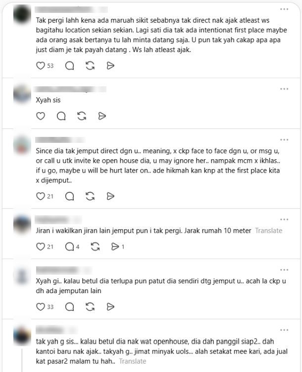 KETIKA ini ramai mengambil peluang menganjurkan rumah terbuka dalam memeriahkan lagi sambutan Aidilfitri sepanjang bulan Syawal.Namun majlis yang sepatutnya menjadi 'jambatan' mengeratkan silaturahim boleh bertukar 'acara' kecil hati apabila ada tidak dijemput menghadiri rumah terbuka. Seperti kisah seorang wanita ini, dia hanya mengetahui mengenai rakan sepejabatnya mengadakan rumah terbuka apabila ditanya oleh rakan lain sama ada dia akan menghadiri majlis itu atau tidak.Katanya, dia berasa terkejut dengan pertanyaan itu kerana tidak mengetahui apa-apa mengenai rumah terbuka tersebut apatah lagi mendapat sebarang jemputan.Ramai mengambil kesempatan menganjurkan rumah terbuka bagi meraikan Syawal. -Gambar hiasan AI"Ada officemate saya ni buat open house. Pada mulanya saya tak dijemput. "Saya dapat tahu secara tidak sengaja apabila seorang lagi officemate tanya, saya pergi tak open house rumah XXX itu nanti."Jadi saya jawab, saya tak tahu pun XXX buat open house," tulisnya dalam perkongsian di Threads.ARTIKEL BERKAITAN: Tak kenal erti halal haram! Lelaki rambut panjang ceroboh majlis akikah, pura-pura buat ‘content’ video sebelum makanARTIKEL BERKAITAN: Rancang majlis kahwin ala ‘open house’, wanita tak mahu naik pelamin... Paling penting tetamu dapat makan sedap!Menurutnya, pada awalnya dia langsung tidak berkecil hati tidak dijemput malah beranggapan rakan sepejabatnya itu hanya mengadakan majlis kecil-kecilan dengan tetamu terhad.Keadaan bertukar janggal apabila beberapa jam kemudian dia mendapat undangan namun disampaikan menerusi rakan rakan sekerja yang lain dan bukan tuan badan.Situasi itu menimbulkan tanda tanya dalam dirinya, sekali gus membuatkan dia mempersoalkan keikhlasan jemputan tersebut.Seorang wanita berkongsi kisah apabila tidak dijemput ke rumah terbuka rakan sepejabat, sebelum mengetahuinya secara tidak sengaja.Dia pada awalnya tidak berkecil hati dan menyangka majlis diadakan secara kecil-kecilan.Beberapa jam kemudian, dia menerima jemputan yang disampaikan melalui rakan sekerja lain.Situasi itu menimbulkan tanda tanya dan membuatkan dia meragui keikhlasan jemputan tersebut.Netizen memberi pelbagai reaksi, ada menyuruh hadir seperti biasa, ada juga menyokong jika dia memilih untuk menolak.Ringkasan ini dijana oleh AI"Kalau korang, korang pergi tak open house dia nanti? Iyalah mula-mula kan dia memang tak jemput pun kita. Dia jemput balik ni pun sebab terkantoi saya tahu dia buat open house tapi tak jemput saya."So, dia memang tak nak jemput kita la kan?" kongsinya lagi.Perkongsian wanita berkenaan mengundang pelbagai reaksi dalam kalangan netizen yang berkongsi pandangan masing-masing.Ada yang berpendapat wanita itu tidak perlu berfikir bukan-bukan dan menganggap jemputan tersebut mungkin sekadar terlepas pandang pada awalnya.Sebahagian komen netizen.Namun, tidak kurang juga merasakan wanita itu berhak menolak secara baik jika berasa kurang selesa, apatah lagi apabila jemputan tersebut dilihat seperti dibuat selepas 'terkantoi'."Kalau betul dia terlupa, mesti dia akan jemput sendiri. Kan open house dia, kenapa pula orang lain kena jemputkan. "Kalau awak selesa ikhlas nak silaturrahim demi Allah, sila pergi. Tapi kalau awak rasa tersinggung, utamakan perasaan awak. "Secara positif mungkin dia terlupa. Ramai sangat kawan kot. Tapi kalau selepas tu dia jemput melalui orang tengah, bermakna dia ajak-ajak ayam," komen netizen.