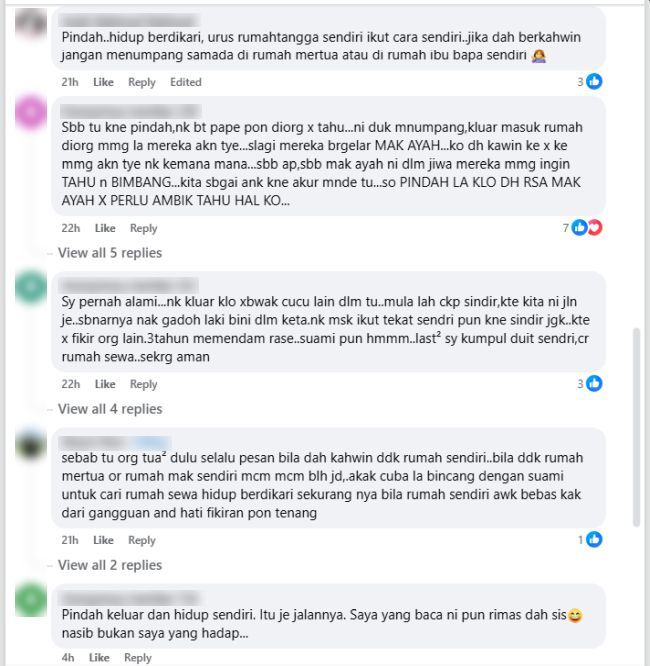 TIDAK semua pasangan berpeluang untuk hidup berdikari sebaik mendirikan rumah tangga. Atas faktor kewangan, komitmen atau tanggungjawab keluarga, ada yang terpaksa tinggal sebumbung bersama mentua buat sementara waktu. Namun, situasi itu kadangkala boleh menimbulkan cabaran tersendiri, terutama daripada segi privasi dan ruang sebagai suami isteri seperti yang diluahkan oleh seorang wanita ini.Menerusi perkongsiannya, wanita berkenaan mengakui dia mula berasa rimas apabila setiap pergerakannya sering menjadi perhatian ahli keluarga mentua.Menetap sebumbung dengan mentua mempunyai banyak cabaran terutamanya privasi. -Gambar hiasan AI"Setelah kita dah berumah tangga, patut ke hari-hari mak dan ayah mentua atau adik-beradik ipar bertanya setiap kali keluar rumah atau nak pergi ke mana-mana?"Kadang-kadang sampai call suami dua, tiga kali, asyik bertanya macam-macam," kongsinya.Menurutnya lagi, keadaan tersebut membuatkan dia berasa seolah-olah tiada ruang peribadi walaupun sudah bergelar isteri.ARTIKEL BERKAITAN: Ipar suka 'stalk' media sosial, adu domba... Wanita tertekan sikap toksik keluarga mentuaARTIKEL BERKAITAN: Mentua ‘triggered’ baca komen menantu dalam grup WhatsApp keluarga... Tak sampai 24 jam terus ‘tendang’ keluar!"Kadang-kadang terasa rimas apabila selalu orang bertanya apabila kita keluar bersama sebagai suami isteri."Entahlah, apabila duduk rumah mentua ni macam-macam hal kena report, especially dengan mak dan ayah mentua," ujarnya.Tambah wanita itu, perkara kecil seperti keluar makan bersama suami juga menjadi sukar apabila perlu memaklumkan mentua terlebih dahulu demi menjaga hati mereka.Seorang wanita rimas kerana perlu melaporkan setiap pergerakan kepada keluarga mentua.Dia berasa tiada privasi kerana kerap ditanya ke mana dan bila keluar rumah.Aktiviti kecil seperti keluar makan dengan suami pun menjadi sukar kerana perlu meminta izin.Ada ahli keluarga ipar yang suka mengikut malah menyindir sekiranya tidak dibawa bersama.Netizen mencadangkan supaya tinggal berasingan demi keharmonian rumah tangga.Ringkasan ini dijana oleh AI"Nak makan atau keluar jalan-jalan dengan suami pun payah, kadang-kadang ada yang nak ikut dan lain-lain."Setiap kali nak keluar makan sekejap pun wajib tanya orang-orang dalam rumah tu dulu sebelum keluar," luahnya lagi.Perkongsian tersebut mengundang pelbagai reaksi dalam kalangan netizen yang rata-rata memahami situasi dialami wanita berkenaan.Ada yang berpendapat perkara itu mungkin berpunca daripada sikap ambil berat keluarga mentua, namun dalam masa sama mengakui pentingnya sempadan dalam kehidupan berumah tangga.Sebahagian daripada komen netizen.Tidak kurang juga yang menyarankan agar wanita tersebut berbincang secara baik dengan suami bagi mencari jalan penyelesaian, termasuk berusaha untuk tinggal sendiri sekiranya berkemampuan demi keharmonian rumah tangga."Sebab itu kena pindah, nak buat apa-apa pun mereka tak perlu tahu."Pindah… hidup berdikari, urus rumah tangga sendiri ikut cara sendiri."Saya pernah alami. Nak keluar kalau tak bawa cucu lain dalam rumah tu, mulalah menyindir," demikian komen netizen.