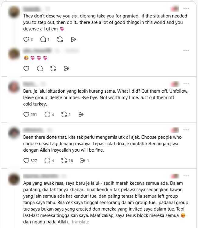 PERSAHABATAN yang terbina selama bertahun-tahun belum terjamin akan bertahan selamanya, lebih-lebih lagi apabila masing-masing melalui fasa kehidupan berbeza.Seperti wanita ini, dia terasa diri disisihkan oleh tiga sahabat baiknya yang dikenali sejak dari zaman universiti sekitar 14 tahun lalu. Menurutnya, hubungan mereka mula rengang tahun lalu apabila dia mendapat tahu tiga sahabatnya keluar bersama dan mendapat tahu perkara itu menerusi perkongsian di media sosial."Tiba-tiba mereka up dekat IG Story, keluar bersama bawa anak-anak tapi saya tak tahu langsung tentangnya. Saya tertanya-tanya dekat mana diaorang bincang?Komitmen terhadap keluarga membuatkan kebanyakan wanita yang sudah berkahwin mempunyai masa terhad untuk bersosial. -Gambar hiasan AI"Saya semak WhatsApp group kami, tidak ada. Sebab takut saya yang terlepas pandang ke apa," tulisnya dalam hantaran di Threads.Biarpun terasa hati dengan tindakan mereka membelakanginya, dia tetap memujuk hati sendiri kerana enggan mengeruhkan persahabatan yang sudah lama terjalin.Namun perasaan sama berulang minggu lalu selepas dia sekali lagi melihat tiga sahabatnya itu berkongsi gambar menghadiri majlis rumah terbuka yang dianjurkan salah seorang daripada mereka tanpa pengetahuannya.Apa lebih meggores perasaan, dia yakin perancangan tersebut dibuat secara peribadi tanpa niat untuk mengundangnya.ARTIKEL BERKAITAN: ‘Bestie’ di pejabat bertukar musuh kerana salah faham, sekarang tengok muka pun benci! Lagi parah tinggal satu tamanARTIKEL BERKAITAN: Baru nak merasa ‘check in’ hotel 5 bintang, ‘bestie’ buat perangai malu tak bertempat... Rendah diri pandu Perodua, tak bagi ‘bellman’ tipTidak mapu memendam persoalan yang bermain di fikiran, dia memberanikan diri menghantar mesej kepada salah seorang sahabatnya untuk mendapatkan penjelasan.Namun, jawapan yang diterima cukup mengecewakan dan seolah-olah dia menjadi punca keretakan hubungan di antara mereka."Dia just reply, 'sorry tau bukan tak nak blast dalam group, kadang-kadang kau pun ada hal tapi faham je'."Saya bertambah hairan sebab selama ini kalau diorang ajak lepak, tak pernah diorang yang datang daerah saya duduk ya. Sentiasa saya yang pergi dekat belah diorang.Seorang wanita sedih disisihkan tiga rakan rapat yang dikenali sejak universiti.Dia melihat rakan-rakannya keluar bersama tanpa pengetahuannya, di media sosial.Perasaan sedih memuncak apabila sekali lagi tidak dijemput ke majlis rumah terbuka salah seorang rakannya itu.Dia bertindak meminta penjelasan salah seorang daripada mereka namun jawapan diterima mengecewakan.Dia akhirnya sedar dan menilai semula persahabatan tersebut.Ringkasan ini dijana oleh AI"Kalau betul saya yang toksik atau ada salah, boleh cakap je. Dah 14 tahun kawan, bukan baru setahun dua," tulisnya.Tambah wanita tersebut, dia bertambah sedih apabila mengenangkan usaha dibuat untuk menjadi seorang sahabat yang baik selama ini tidak dihargai."Kalau ada yang nak pinjam duit, tak pernah saya tak hulur. Birthday diorang, saya tak lupa walaupun diorang tak ingat birthday saya. Saya kirim dan order kek atau air guna p-hailing."Saya hidupkan group WhatsApp bila agak-agak lama sunyi. Saya tak tahu apa salah saya," akhirinya.Sebahagian daripada perkongsian netizen.Perkongsian wanita ITU mengundang perhatian netizen yang menasihatkan agar dia meletakkan batas memandangkan rakan-rakannya tidak lagi melihatnya sebagai sahabat."Pilih mereka yang memilih kamu, sis. Lagi tenang rasanya."Serahkan pada Allah... Jangan mengharap kepada manusia."Kalau perlu berundur, teruskan. Banyak lagi benda baik di dunia," demikian antara komen netizen.