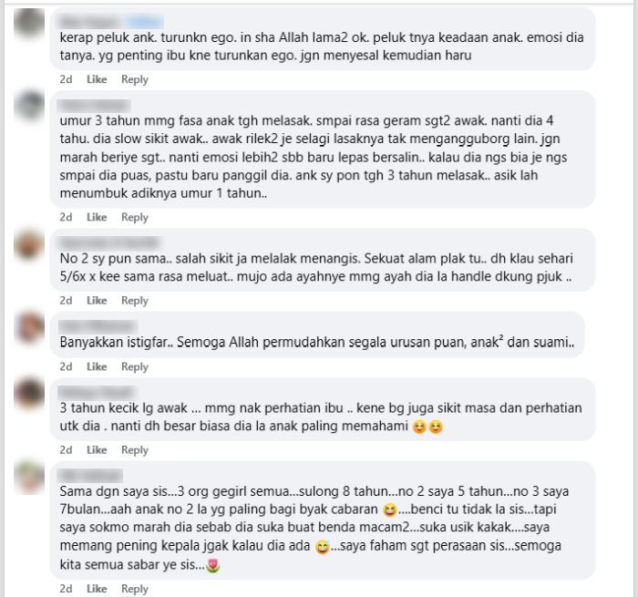 BUKAN pilih kasih, namun emosi seorang ibu juga ada turun naiknya.Demikian situasi dialami seorang wanita ini yang mengakui berdepan konflik perasaan apabila sukar mengawal kemarahan terhadap anak keduanya, meskipun menyayangi kanak-kanak tersebut. Menerusi perkongsian di laman sosial, dia yang merupakan ibu kepada tiga orang anak perempuan berusia sembilan tahun, tiga tahun dan lima bulan itu berkata, keadaan tersebut berlaku kerana kerenah anak keduanya itu yang kerap mencabar serta menguji kesabarannya. Tiada anak yang patut dipinggirkan dalam soal perhatian dan kasih sayang. -Gambar hiasan AI"Kadang sampai saya tak boleh handle, saya memang bagi terus dekat ayah dia. "Saya tak tahu kenapa. Kadang-kadang saya rasa macam menyampah sangat dengan perangai dia yang seperti minta perhatian."Kalau dia bergaduh dengan kakak atau buat perangai, memang saya marah dia je. Kakak dia saya marah biasa-biasa je. Yang kedua ni saya marah betul-betul sampai tak boleh tengok muka dia," luahnya.ARTIKEL BERKAITAN: Diberi makan sedap, belikan motosikal baharu... Gadis terkilan mak ayah lebih sayang anak lelaki, disuruh makan sisa 'fast food' adikARTIKEL BERKAITAN: Hanya kerana sebiji telur, anak terasa hati bertahun-tahun... Sedih ibu tak jaga perasaan walaupun bagi duit belanja setiap bulanNamun di sebalik kemarahan yang dihamburkan, wanita tersebut kemudiannya akan mengalirkan air mata lantaran diselubungi rasa bersalah."Walaupun rasa macam tu, tapi saya belum tahap dera anak lagi."Apabila dia tidur, saya rasa kasihan. Saya tahu mungkin dia cemburu sebab perhatian saya lebih pada adik yang masih kecil," katanya lagi.Seorang ibu mengaku sukar kawal kemarahan terhadap anak kedua walaupun menyayanginya.Dia mempunyai tiga anak perempuan dan mengakui anak kedua sering menguji kesabaran serta emosi.Ibu tersebut cenderung memarahi anak kedua dengan lebih keras berbanding anak sulung, terutama apabila berlaku pergaduhan.Dia kemudian dilanda rasa bersalah dan kasihan, menyedari anak itu mungkin cemburu dengan perhatian kepada adik kecil.Perkongsian itu mendapat reaksi ramai ibu lain yang berkongsi pengalaman sama serta memberi sokongan dan nasihat.Ringkasan ini dijana oleh AIWanita berkenaan turut mengakui dia menyayangi kesemua anaknya, namun berasa takut dengan emosi negatif yang hadir tanpa diduga.Malah, dia juga belum bersedia untuk berkongsi perkara tersebut dengan suaminya memandangkan anak kedua itu merupakan anak yang sangat dinanti-nantikan selepas melalui tempoh TTC (trying to conceive) yang panjang."Saya sayang anak-anak saya dan saya tak suka apabila ada perasaan macam ini. Saya harap ia hanya sementara."Ada ke ibu-ibu yang macam saya? Macam mana ye nak hilangkan perasaan macam ni," luahnya lagi.Netizen tampil berkongsi pandangan dan nasihat. Di ruangan komen, rata-rata warga maya khususnya golongan ibu tampil berkongsi pengalaman hampir sama selain memberikan kata-kata sokongan kepada wanita berkenaan.Ada yang berpendapat situasi tersebut adalah perkara biasa, terutama apabila anak berada dalam fasa mencari perhatian selepas kehadiran adik baharu dalam keluarga.Ada juga yang mencadangkan agar wanita tersebut meluangkan masa berkualiti dengan anak-anaknya bagi mengurangkan rasa cemburu selain membantu mengeratkan hubungan.