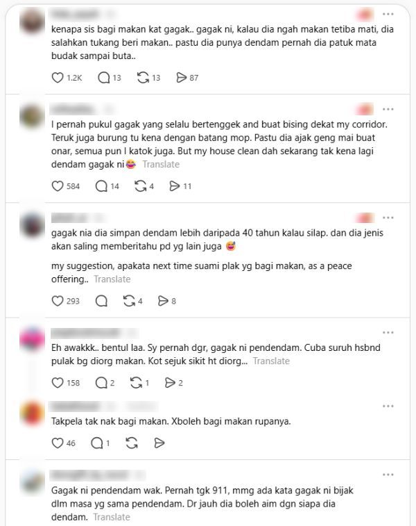 ADA beranggapan ia sekadar kebetulan, namun tidak kurang ada juga yang percaya bahawa haiwan tertentu mampu 'menyimpan' memori, malah dendam terhadap manusia. Kisah yang dikongsikan seorang wanita ini mengundang perhatian apabila suaminya didakwa menjadi mangsa 'dendam' sekumpulan burung gagak hanya kerana satu insiden kecil. Menurut wanita berkenaan, segala-galanya bermula apabila suaminya menyapu makanan yang diberi untuk 'santapan' haiwan berkenaan.Ada yang percaya gagak menyimpan dendam terhadap manusia yang pernah mengancam atau menyakitinya. -Gambar hiasan AI"Macam mana nak hentikan dendam burung gagak ya? Suami saya sampai stres. Saya selalu beri gagak makan kalau ia datang bertenggek atas kereta."Tapi ada satu hari tu, suami saya sapu makanan tu. Semenjak daripada tu, kalau suami memandu dan park mana-mana, kereta dia akan penuh tahi burung."Walaupun pergi beli barang dapur dekat kedai runcit depan taman," tulisnya dalam satu hantaran di Threads.ARTIKEL BERKAITAN: Angsa kenang jasa! Ramai kagum lihat hubungan sweet pemuda ini dengan Seman - “Kami rapat selepas saya bantu ‘bini’ dia”ARTIKEL BERKAITAN: Kerja part time pemandu Grab, tapi bakal guru rela poket kosong asal dapat ‘kenyangkan’ haiwan jalanan - “Rasa bersalah kalau lalu tak bawa makanan”Menurut wanita itu, kejadian tersebut bukanlah sesuatu yang asing kerana dia juga pernah melalui pengalaman hampir sama sebelum ini."Dulu saya bagi kucing makan dekat luar rumah. Rupanya gagak yang datang makan. Lepas tu saya tak bagi dah. Jadi lepas tu gagak selalu datang dan campak hanger saya."Ia akan kuis hanger dan baju di ampaian, sampai bersepah. Bermula daripada itu, saya mula bagi gagak makan dan ia tak kacau dah."Sekarang suami pula kena disebabkan insiden dia sapu makanan tu. Kadang kesian, kadang tu kelakar sebab dia pergi kedai lima minit je, tapi bumbung dan cermin depan dah bertompok-tompok," kongsinya lagi.Seorang wanita mendakwa suaminya menjadi sasaran ‘dendam’ burung gagak selepas satu insiden kecil.Kejadian bermula apabila suaminya menyapu makanan yang biasa diberi kepada gagak.Sejak itu, kereta suaminya sering dipenuhi tahi burung setiap kali parkir di mana-mana.Wanita itu turut berkongsi pengalaman lama apabila gagak mengganggu rumahnya selepas berhenti diberi makan.Netizen percaya gagak bijak dan menyarankan memberi makan semula sebagai tanda 'berdamai'.Ringkasan ini dijana oleh AIPerkongsian tersebut mencetuskan pelbagai reaksi dalam kalangan netizen.Ada yang terhibur dan menganggap ia pengalaman lucu.Dalam kalangan netizen turut berkongsi pandangan dan pengalaman masing-masing, malah ada yang percaya burung gagak sememangnya 'bijak' serta mampu mengenali individu tertentu. Sebahagian daripada komen netizen.Justeru mereka menyarankan supaya suaminya kembali memberi makanan sebagai 'tanda damai', selain cuba mengelak daripada mengganggu haiwan berkenaan."Kalau tak silap gagak ni dia simpan dendam lebih daripada 40 tahun. Dan ia jenis akan saling memberitahu pada yang lain juga."Apa kata next time suami pula yang bagi makan, sebagai tanda berdamai."Gagak ni pendendam. Memang ada kata gagak ni bijak dalam masa yang sama pendendam. Dari jauh dia boleh aim dengan siapa dia dendam," demikian antara komen netizen.