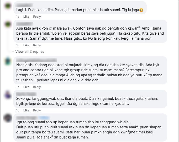 SETIAP lelaki sama ada bujang atau pun sudah berkahwin pasti mempunyai hobi atau me time sendiri bersama rakan-rakan. Ada memilih untuk bersukan, memancing atau melakukan aktiviti konvoi motosikal seperti ride yang semakin popular dalam kalangan kaum Adam. Namun, di sebalik keseronokan itu, ada juga isteri berdepan dilema apabila masa suami bersama keluarga mula terhad demi hobi dan rakan-rakan, sebagaimana luahan dikongsikan seorang wanita ini."Hari ini akhirnya suami berjaya pergi ride selepas beberapa kali lepas kahwin dia nak pergi ride tapi saya halang. Dalam grup ride, kawan dia cakap, dah dapat 'lesen' ke belum.Hobi ride motor bukan sekadar perjalanan, tapi cara menikmati kebebasan di setiap kilometer. -Gambar hiasan"Maksudnya memang dia pernah cakap dengan kawan dia yang isteri tak bagi pergi ride. "Kawan dia sambung lagi, berkeras lah sikit dengan bini tu. Kita suami, kita beli beras. Saya baca rasa terbakar sangat," kongsinya. Namun begitu, dia memilih untuk berdiam diri dan tidak membincangkan perkara itu dengan suaminya kerana bimbang akan menimbulkan konflik lebih besar dalam rumah tangga mereka.Menurutnya lagi, suaminya cenderung mempertahankan rakan-rakan dan dirinya yang sering menjadi tempat melampiaskan kemarahan lelaki tersebut apabila berlaku pertikaian.ARTIKEL BERKAITAN: Nak ganti kasut kerja pun berkira, jimat demi keluarga... Isteri hamil rancang hadiahkan suami PS5, mahu pasangan ada masa untuk diri sendiriARTIKEL BERKAITAN: Tambah koleksi mainan boleh, tambah ‘cawangan’ minta maaf! Isteri support hobi unik suami, beli kren RM4,000 pun tak ada masalah"Beras dekat rumah ni pakai duit saya. Suami hanya bayar duit rumah sahaja. Itu pun tiga perempat. Satu perempat dari bayaran rumah tetap saya bayar. "Komitmen rumah tangga RM4,500 termasuk bayar rumah. Suami bagi RM2,000... saya tambah RM2,500. "Dia ada kerja part time pun tak selalu tambah kalau perlu duit lebih. Tapi saya tetap jaga aib dia," katanya.Lebih melukakan hati, suaminya hanya meninggalkan RM20 sebelum keluar berkonvoi seolah-olah terlupa tanggungjawab di rumah kerana terlalu teruja keluar bersama rakan-rakan.Seorang wanita kecewa apabila suaminya utamakan hobi berkonvoi bersama rakan-rakan sehingga abai tanggungjawab keluarga.Dia geram suami pernah memberitahu rakan-rakan bahawa dihalang untuk berkonvoi.Dia berdiam diri walaupun membantu menanggung sebahagian besar komitmen rumah tangga demi menjaga aib suami.Dia turut kecewa apabila suami hanya meninggalkan sedikit wang sebelum keluar berkonvoi.Netizen menasihatkan supaya dia lebih tegas soal kewangan dan menjaga diri demi kesihatan dan keyakinan diri.Ringkasan ini dijana oleh AI"Macam tu punya seronok dia dapat keluar dengan kawan sampai lupa nak tinggal duit makan. "Bila saya tak bagi dia pergi ride, kerja rumah semua dia tinggal. Matilah saya. Saya kerja lagi, kerja rumah lagi. "Saya pernah cakap bawa saya sekali, dia bagi alasan saya tak tahanlah dan sebagainya. Berat saya 110 kilogram (kg) jadi mungkin dia takut motor 125 dia tu jahanam kot. "Bila jadi macam ni berkobar-kobar nak kuruskan diri dan cari orang lain. Apa yang saya nak buat sekarang ye?Antara respon netizen."Memikirkan suami berseronok dekat luar, sangat cemburu," kongsinya lagi. Di ruangan komen, warga maya memberikan reaksi yang pelbagai.Ada yang menyarankan wanita berkenaan lebih bertegas dengan suaminya soal tanggungjawab kewangan dan komitmen dalam rumah tangga. Tidak kurang juga ada yang menasihatkannya untuk lebih menitikberatkan penampilan bukan hanya untuk suami, tetapi kesihatan diri sendiri.