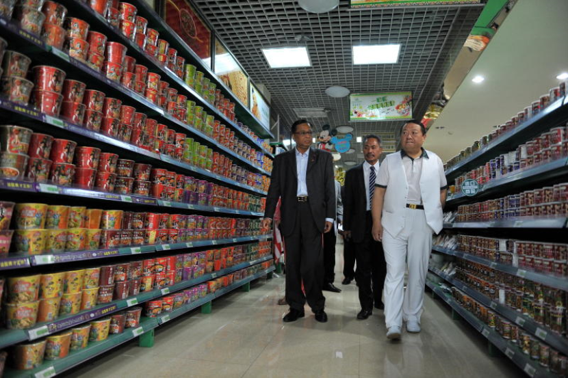 Menteri Pertanian dan Industri Asas Tani, Datuk Seri Ismail Sabri Yaakob diiringi Pengerusi Biro Pengarah Xi' An San Bao Shang Xi Group Company merangkap pemilik Shanbao Hypermarket, Sha Pengcheng melihat barangan makanan keluaran Agromas Malaysia yang dijual dalam pasaran China ketika melawat rangkaian hypermarket muslim di Xi'an pada Selasa.