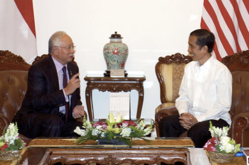 Najib (kiri) mengunjungi Presiden Indonesia yang baharu, Joko Widodo atau lebih dikenali sebagai Jokowi selepas majlis mengangkat sumpah pelantikannya sebagai presiden Indonesia yang ke-7 di Istana Merdeka di sini, Isnin.