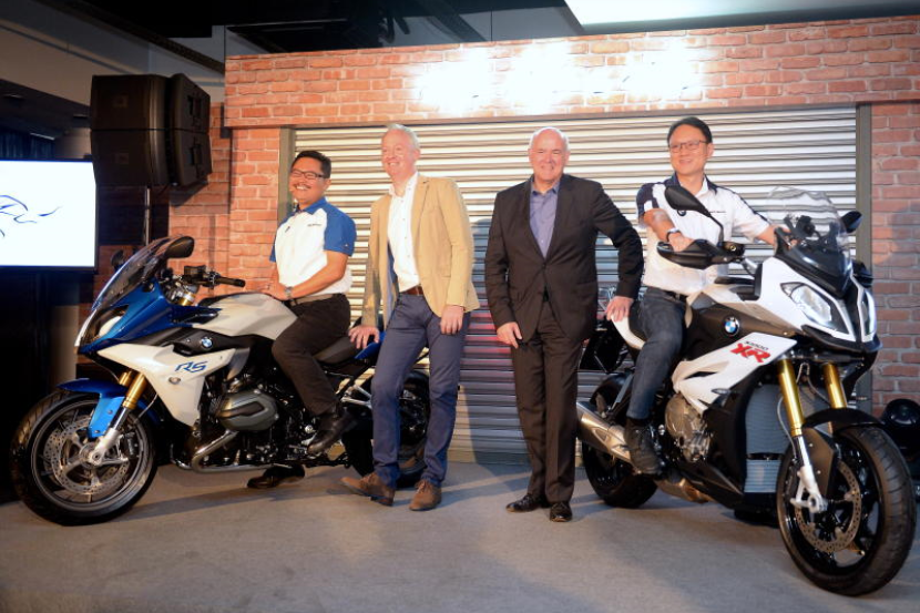 Alan Harris (dua,kanan) bersama Ketua BMW Motorrad Malaysia Owen Riley (dua,kiri) memperkenalkan dua motorsikal BMW S 1000XR dan BMW R 1200RS pada majlis memperkenalkan motorsikal baru BMW pada Khamis.