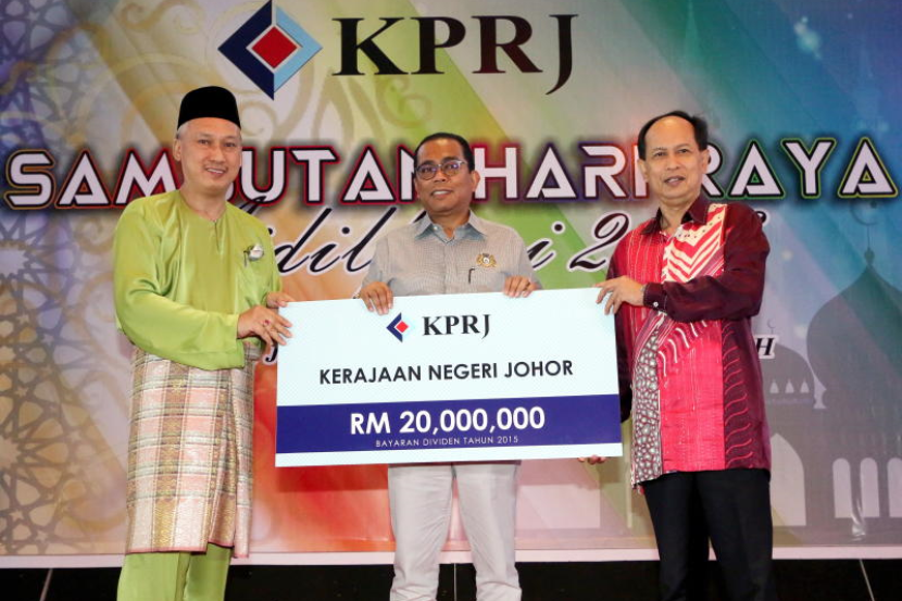 Cek dividen berkenaan disampaikan Ketua Pegawai Eksekutif KPRJ Abd Razak Mohd Yusoff kepada Pegawai Kewangan Negeri Mohd Nasir Abd Salam yang disaksikan Mohamed Khaled, pada majlis Rumah Terbuka Aidilfitri KPRJ, di Pusat Konvensyen Danga Bay, di sini, Ahad.