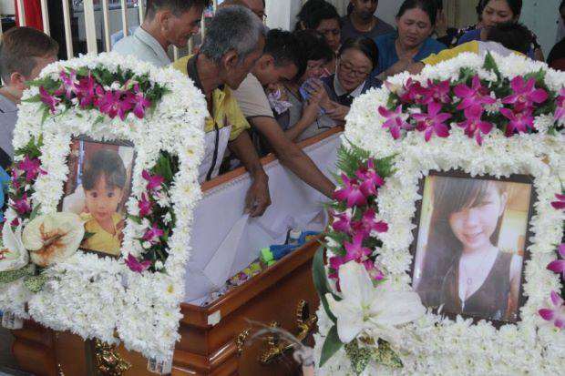BUTTERWORTH: Suasana suram menyelubungi upacara pengebumian Tan Li Gian, 21, dan anak lelakinya berusia tiga tahun, Eonithin yang mayat mereka ditemui terdampar di pantai Teluk Bahang pada Rabu lalu.