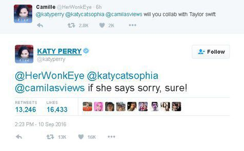 PENYANYI Katy Perry menjawab pertanyaan seorang peminatnya yang bertanya sama ada dia mahu berkolaborasi dengan penyanyi popular Taylor Swift.
