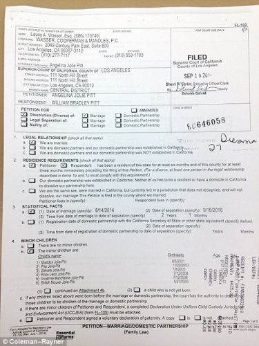 Dalam pada itu, Daily Mail melaporkan punca Angelina memfailkan perceraian tersebut kerana tidak berpuas hati dalam kaedah aktor itu mendidik anak-anak mereka selain menyifatkan suaminya itu bukan seorang bapa yang berwibawa.