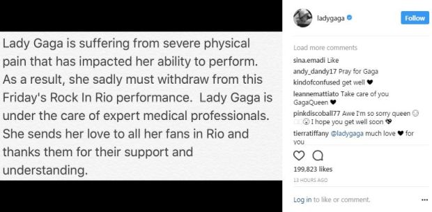 Menerusi foto yang dimuat naik di laman Instagram @ladygaga, dia memberitahu sakitnya kali ini agak luar biasa sehingga perlu membatalkan konsert tersebut.