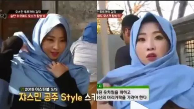 Menurut laporan Soompi, Minzy memakai tudung ketika mengunjungi salah sebuah masjid di negara tersebut.