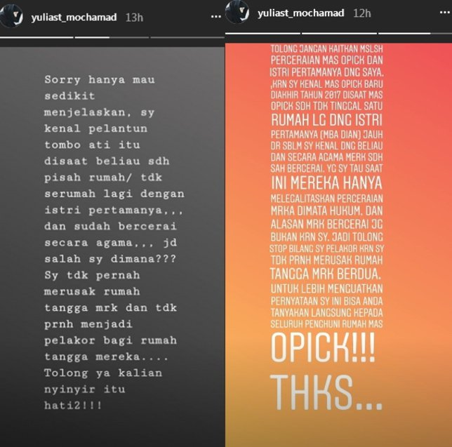 "Tolong jangan kaitkan masalah perceraian Opick dan isteri pertamanya dengan saya kerana saya kenal Opick diakhir tahun 2017 ketika dia sudah tidak tinggal satu rumah lagi dengan isteri pertamanya.