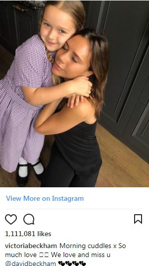"Morning cuddles x So much love We love and miss u David Beckham, (kami sayang dan rindu kamu David Beckham) " tulisnya.