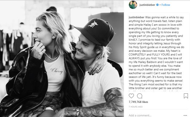 Justin, 24, dilaporkan melamar Hailey, 21, ketika mereka sedang bercuti di Bahamas.