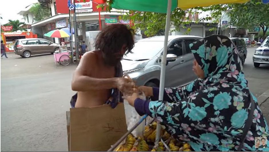 Baim Wong ketika menyamar menjadi orang gila kepada penjual pisang.