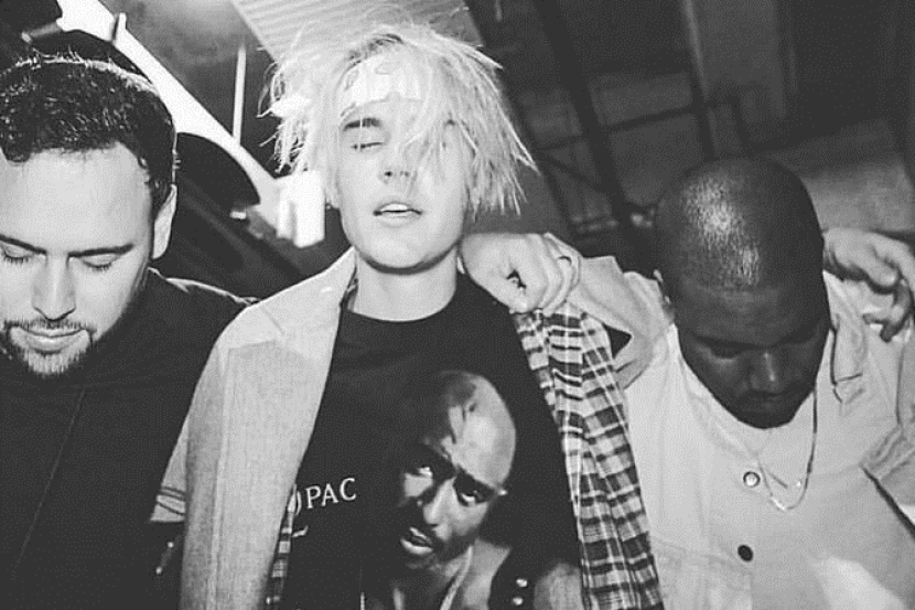 Menerusi foto hitam putih, Justin kelihatan sedang berpelukan dengan penyanyi rap Kenya dan pengurusnya Scooter Braun.