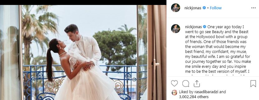 "Saya sangat bersyukur dengan perjalan hidup kami setakat ini. Anda (Priyanka Chopra) membuat saya tersenyum setiap hari. Saya amat berbangga menjadi suamimu," tulis Nick.