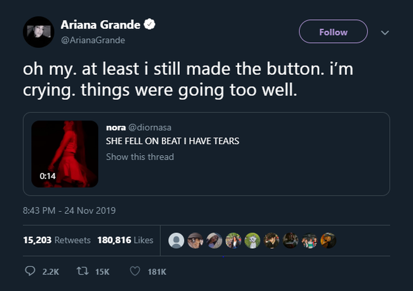 Dalam pada itu, penyanyi lagu Dangerous Woman ini tidak malu dengan apa yang berlaku malah sempat mengulang kicau video tersebut di Twitter yang dimuat naik oleh salah seorang peminatnya meskipun dia memiliki lebih daripada 67 juta pengikut.