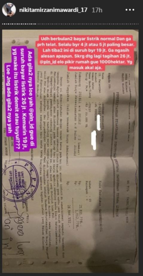 AKTRES kontroversi Indonesia, Nikita Mirzani meluahkan rasa tidak berpuas hati apabila bil elektrik rumahnya tiba-tiba sahaja melambung tinggi.