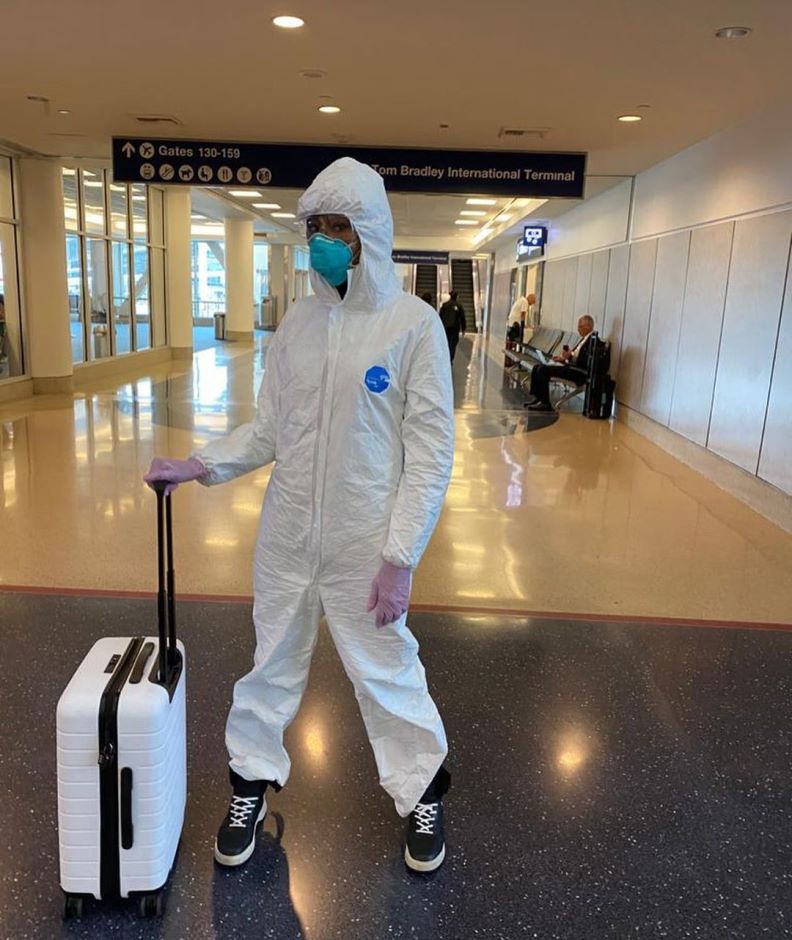 Naomi Campbell memakai hazmat suit di Lapangan Terbang Antarabangsa Los Angeles.