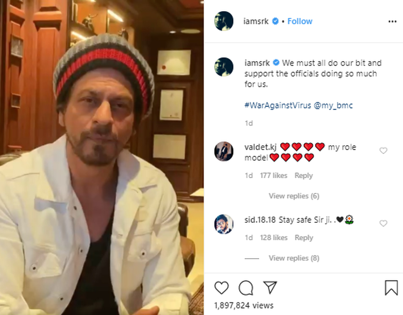 Menerusi Instagram, Shah Rukh Khan atau SRK meminta masyarakat tidak mendedahkan diri dengan virus tersebut dan sentiasa mengikuti langkah-langkah pencegahan.