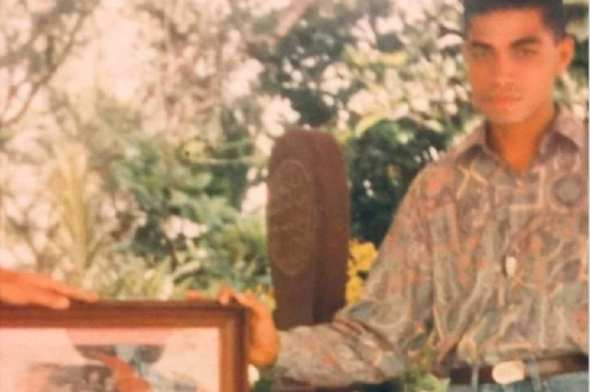 Foto lama itu memperlihatkan dia berdiri di sebelah kubur dengan memakai baju kemeja bercorak dan seluar jeans.