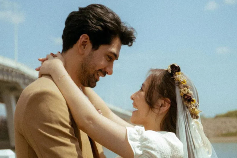Prilly dilihat cantik mengenakan gaun putih seperti busana pengantin, manakala Reza pula tampil dengan sut berwarna coklat.