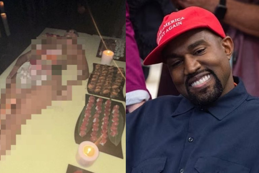 Anak Kanye juga dilihat dengan selamba mengambil sushi dari atas tubuh wanita berkenaan.