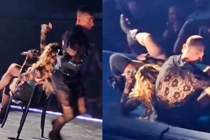 Pemenang anugerah Grammy itu sepatutnya diseret ke bahagian utama pentas namun kasut tumit tinggi dipakai Madonna menyebabkan dia tergelincir sebelum terjatuh.